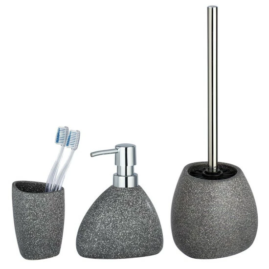Dieses Set besteht aus Zahnbürstenhalter, Seifenspender und WC-Garnitur. So können Sie Ihrem Badezimmer und Gäste-WC einen komplett neuen Look verschaffen.