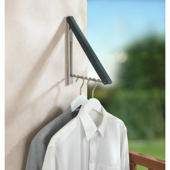 Sie ist flexibel, einklappbar und braucht nur wenig Platz: Diese Klapp-Garderobe eignet sich sehr gut zum Aufhängen und Auslüften Ihrer Kleidung auf Ihrer Terrasse oder Ihrem Balkon. Durch die schmale Konstruktion lässt sie sich einfach und schnell ein- oder ausklappen. Die Garderobe hat gestanzte Vorrichtungen, die es möglich machen, bis zu acht Kleiderbügel aufzuhängen. Sie besteht aus Kunststoff und rostfreiem Edelstahl. Deshalb ist sie sehr robust und trotzt jedem Wetter. Das benötigte Befestigungsmaterial ist im Lieferumfang enthalten.