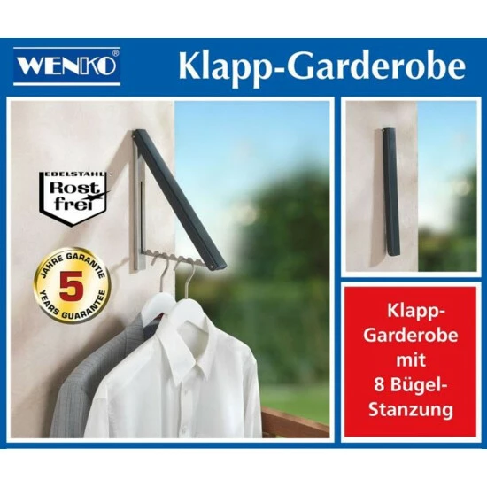 Klappbarer Kleiderbügel aus Edelstahl der Marke WENKO ist eine großartige Ergänzung für jeden Flur, jede Umkleidekabine oder Umkleidekabine. Darüber hinaus wird es auch auf der Terrasse oder dem Balkon verwendet. Es zeichnet sich nicht nur durch originelles Design aus, sondern auch durch einfallsreiche und praktische Verarbeitung und stabile Konstruktion.