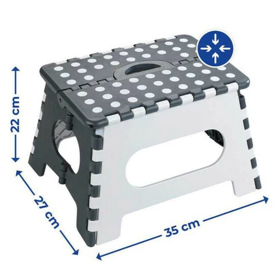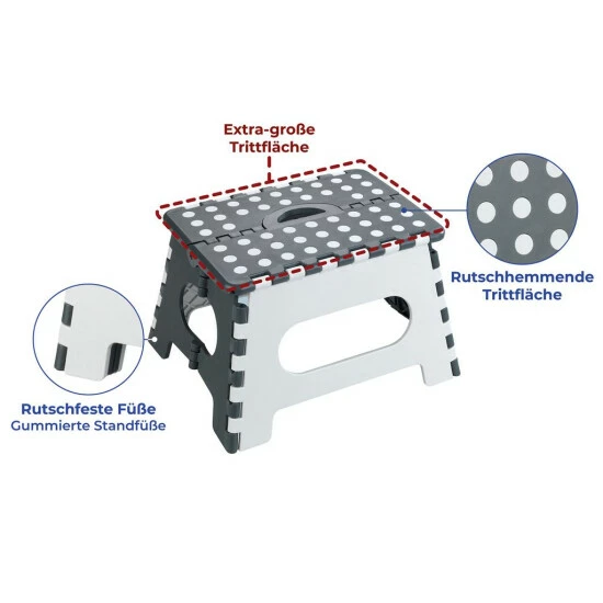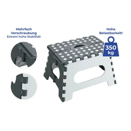 Der hochwertige Hocker aus robustem Kunststoff ist dabei extrem stabil, langlebig und bis 350 kg belastbar. Dabei verfügt der clevere Tritthocker über eine extra-große rutschhemmende Trittfläche und bietet dank der enorm hohen Stabilität durch die Mehrfach-Verschraubung immer einen sicheren Halt. Zusätzlich sorgen die gummierten Standfüße für eine zusätzliche Rutschfestigkeit. So haben Sie bei all Ihren Aktivitäten immer einen sicheren Halt. Sofern Sie den Klapptritt nicht mehr benötigen, kann dieser platzsparend zusammengeklappt und verstaut werden. Der integrierte Griff macht ein leichtes Transportieren möglich.