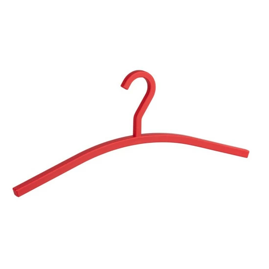 Der hochwertige Bügel in modernem, kantigem Design ist aus stabilem Kunststoff in mattiertem Rot gefertigt und macht sowohl im Kleiderschrank als auch in der Garderobe eine besonders gute Figur.