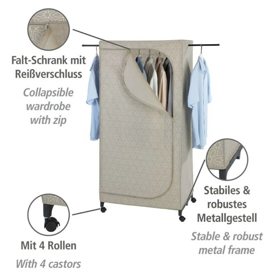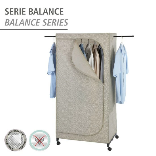 BALANCE Textilkabinett ist ein Vorschlag der deutschen Marke WENKO, der sich auf die gleichzeitige Schaffung nützlicher und ästhetischer Objekte spezialisiert hat. Die hohe Qualität der verwendeten Materialien macht dieses Produkt lange Zeit. Die Garderobe besteht aus strapazierfähigem und atmungsaktivem Material , das der Kleidung eine ausreichende Luftzirkulation und Staubschutz bietet. Darüber hinaus verfügt es über eine Metallstruktur und vier Räder, die es ihm ermöglichen, sich bequem an einen geeigneten Ort zu bewegen. Es verfügt über einen Reißverschluss für den einfachen Zugriff auf Inhalte. Im Inneren hat es einen Stock zum Aufhängen von Kleidung an Kleiderbügeln. Außerdem gibt es auf beiden Seiten draußen einen Platz, an dem Sie Handgepäck wie Handtaschen usw. aufhängen können.