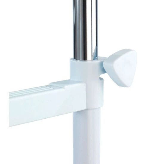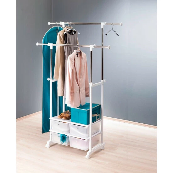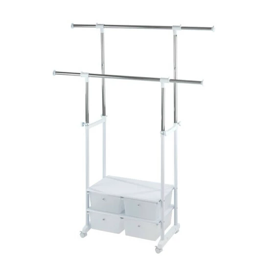 Praktischer Kleiderständer zum Aufbewahren, Lüften und Transportieren von Kleidung. Egal, ob Hemd, Blazer oder Anzug – auf dem Kleiderständer White Star findet alles seinen Platz. Auf zwei in Höhe und Breite verstellbaren Stangen können alle Kleidungsstücke aufgehangen werden. Im unteren Bereich befindet sich eine praktische Ablage für Schuhe oder ähnliches. Mit vier praktischen Schubladen zum staubgeschützten Verstauen von Kleidung oder anderen Artikeln wird zusätzlicher Stauraum geschaffen.