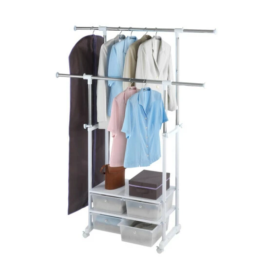Praktischer Kleiderständer zum Aufbewahren, Lüften und Transportieren von Kleidung Mit 4 Rollen zum leichten Fortbewegen 2 Feststellbremsen 2 stufenlos höhenverstellbare Kleiderstangen 4 seitlich ausziehbare Holme 4 praktische Schubladen zum staubgeschützten Verstauen von Kleidung o. ä., mit Ablagefläche für Aufbewahrungsboxen oder Schuhe