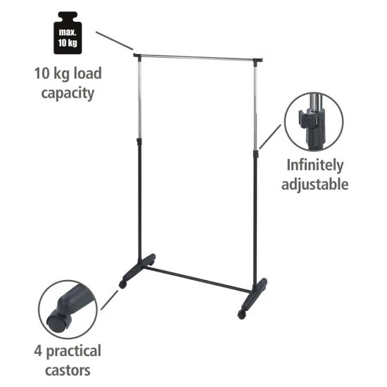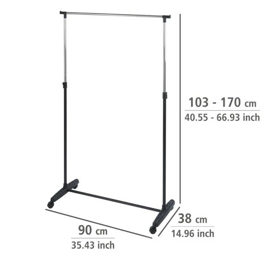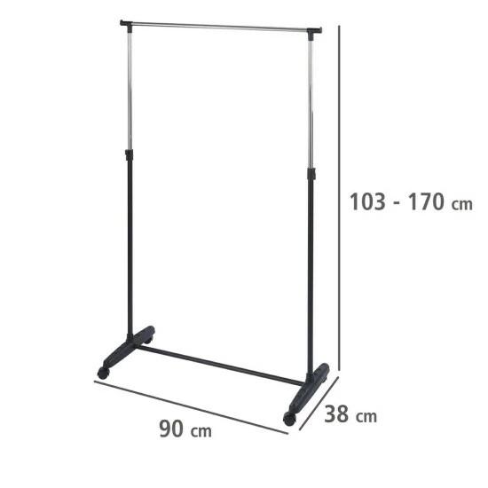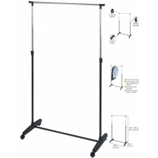 Die höhenverstellbare Kleiderstange kann stufenlos von 103 bis 170 cm verstellt werden, wodurch Hemden, Blusen und Pullover, aber auch Mäntel und Kleider ihren perfekten Platz finden. Der kompakte Garderobenständer ist ganz einfach auf- und abzubauen und kann somit bei Nichtgebrauch platzsparend verstaut werden.