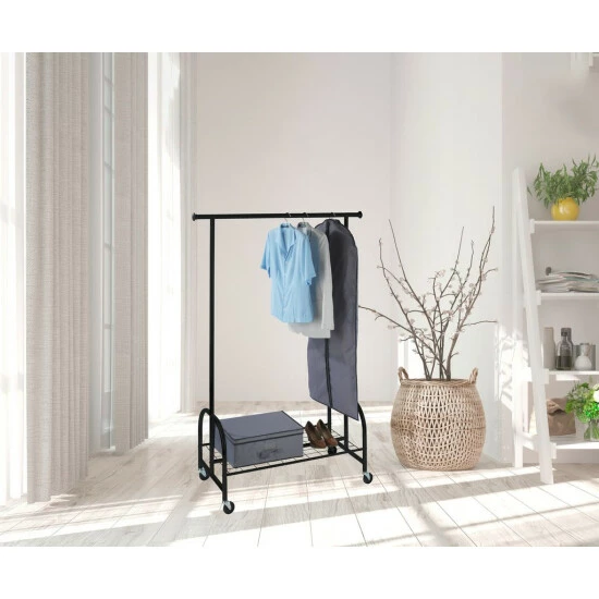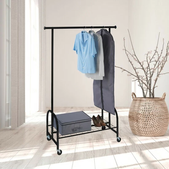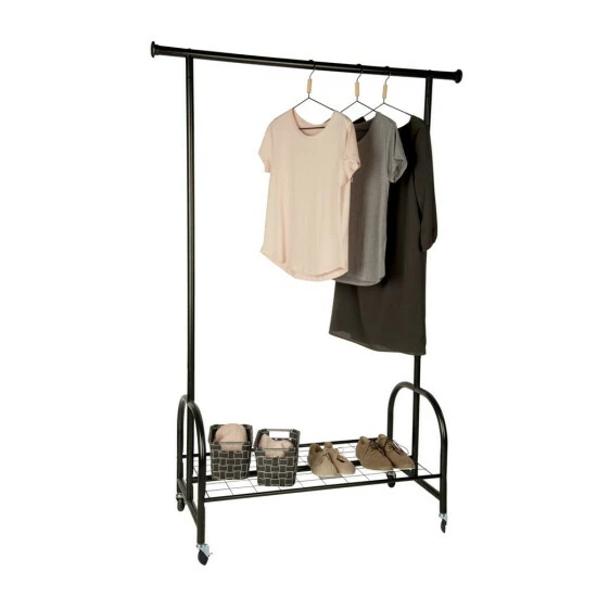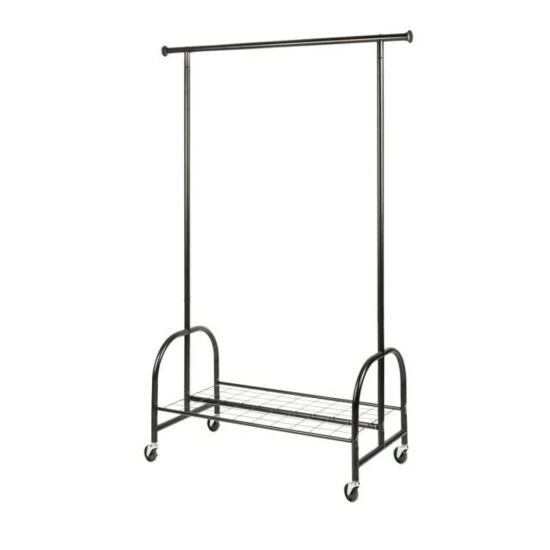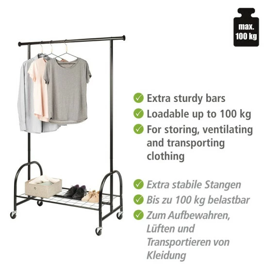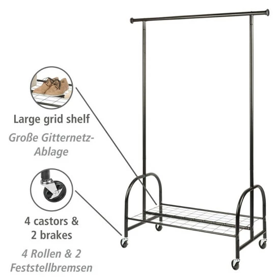 Auf diesem rollbaren Kleiderständer sind Ihre Hemden, Blusen, Jacken oder Mäntel sehr gut aufgehoben. Er kann ein Gewicht bis zu 100 kg tragen. Wegen seiner leichtgängigen Rollen ist er schnell und einfach an jedem beliebigen Ort aufgestellt. Auch zum Lüften und Trocknen Ihrer Kleidung oder um sie von A nach B zu transportieren, ist dieser flexible Kleiderständer ideal. Das Ablagegitter eignet sich perfekt als kleines Schuhregal oder als Aufbewahrungsort für Boxen und Schachteln.