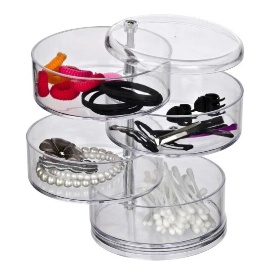 Plastik-Box mit 4 runden Fächern. Perfekt für Aufbewahrung von Kleinkosmetik: Lippenstift, Haarspray, Mascara, Liedschatten, usw. Ideal auch für jegliche Büro-Kleinigkeiten – Heftklammern, Reißzwecken, usw. Jedes der Fächer ist bewegbar, so dass die Sachen immer leicht greifbar sind. Transparente Farbe – hilft den Inhalt schnell einzuschätzen.