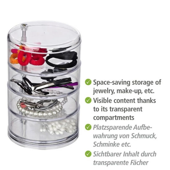 Wenko Femme organisator Sorgen Sie dafür, dass Ihre Schminkutensilien dank dieses WenkoOrganisators ordentlich aufbewahrt werden. Es gibt Platz für Ohrringe, Armbänder und verschiedene Kosmetikprodukte. Spezifikationen: Geschlecht: Damen Farbe: transparent Material: Acryl Durchmesser: 11,5 cm Höhe: 17,5 cm