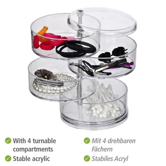 Durch das transparente Design des Kosmetik Organizer, der mit vier drehbaren Fächern ausgestattet ist, ist auf den ersten Blick sofort erkennbar, was sich in dem Fach befindet. Aus Acryl gefertigt bietet der Organizer stabilen Halt. Ein Muss für jeden trendigen Ordnungsliebhaber.