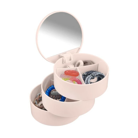 Eine praktische Box mit drei runden Fächern und einem Spiegel. Es ist perfekt für die Aufbewahrung von verschiedenen Arten von Kosmetika, Nagelschmuck, Schmuck, Armbänder, Haargummis, etc. Es wird auch die Funktion eines Klemmbrettes für Büroaccessoires – Büroklammern, Stifte usw. erfüllen. Jedes der Fächer erstreckt sich in jede Richtung, die einen bequemen Zugang zu ermöglicht Inhalt.