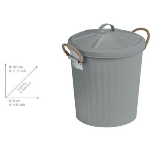 Der graue Eimer aus lackiertem Stahl ist mit zwei geflochtenen Henkeln und einem abnehmbaren Deckel mit Griff ausgestattet und verfügt über ein Fassungsvermögen von 6 Litern.