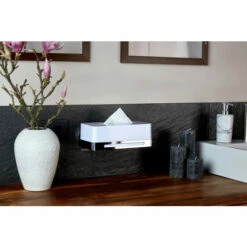 Die Kosmetiktuch-Box mit Wandhalterung bietet einen Schutz- und Dekomantel für handelsübliche, rechteckige Kosmetiktuchboxen.