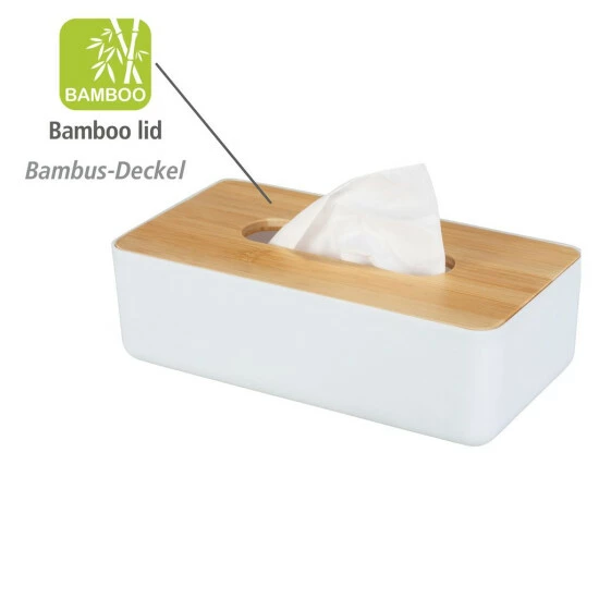 Tücher immer griffbereit mit der Kosmetiktuchbox Rotello. In der Kosmetiktuchbox Rotello von WENKO können Sie Kosmetik- oder auch Taschentücher verstauen und einfach entnehmen werden. Die Box hat nicht nur einen praktischen Nutzen: Das Design der Kosmetiktuchbox verbindet hochwertigen Kunststoff mit natürlichem Bambus und wird so zum dekorativen Element in Ihrem Badezimmer.