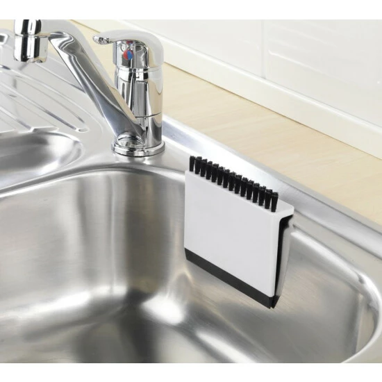 Wasser oder Krümel in Zwischenräumen: Dieser Küchenhelfer packt sie. Mit der Gummi-Lippe können Wasser und andere Flüssigkeitsrückstände einfach von der Arbeitsfläche oder vom Arbeitsbrett gewischt werden. Die Bürste fegt grobe Krümel und Küchenschnitte schnell aus dem Weg. Sogar schwer erreichbare Bereiche an Fliesenkanten oder in Zwischenräumen erreichen Sie mit diesem Küchenhelfer problemlos. Imme da, wenn Sie ihn brauchen: Der Küchenhelfer kann einfach am Rand des Spülbeckens gehängt werden. Er wird über seine Form und seine gummierte Rückseite sicher am Becken-Rand gehalten.