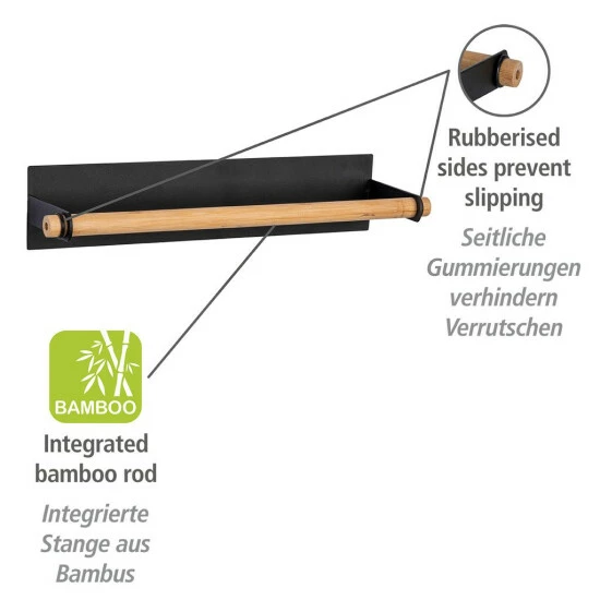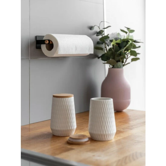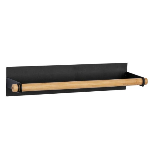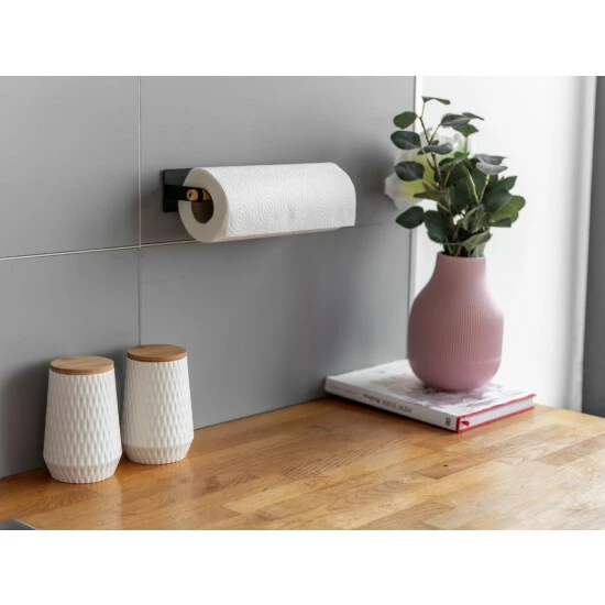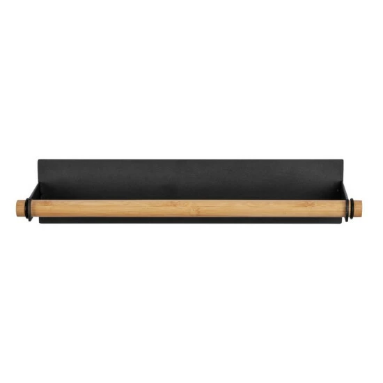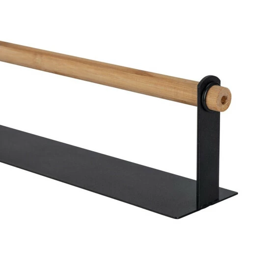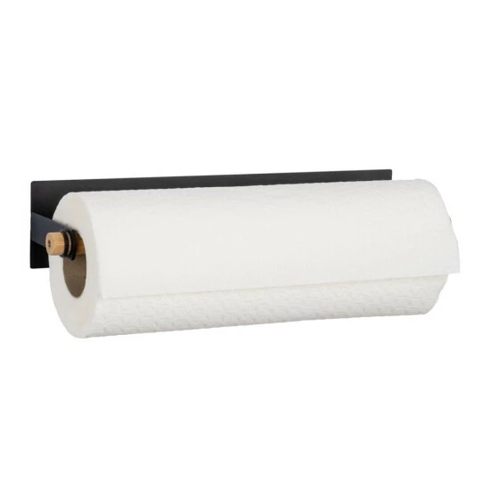 Durch die erhöhte Anbringung haben Sie die Küchentücher stets griffbereit, vor allem wenn einmal Eile geboten ist und schnell etwas aufgewischt werden muss. Das dezente Design aus pulverbeschichtetem Metall in Schwarz in Verbindung mit dem natürlichen Hellbraun der integrierten Stange aus Bambus strahlt Ruhe und Eleganz aus und fügt sich in Ihre Kücheneinrichtung ein. Zwei kleine Ringe an den jeweiligen Enden verhindern ein Verrutschen der Bambus-Stange beim Abrollen des Papiers.