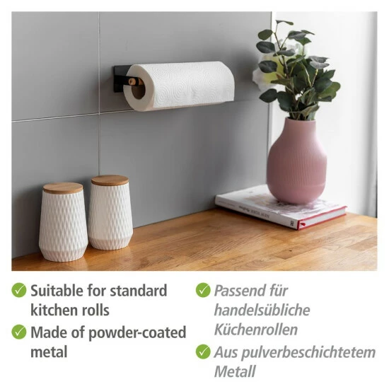 Die Küchenrolle ist fester Bestandteil jeder Küche. Das Papier muss immer griffbereit sein – zum Wischen, Trocknen oder Abtropfen. Der Küchenrollenhalter Magna von WENKO bietet die perfekte, platzsparende Aufbewahrungsmöglichkeit für die nützlichen Papierrollen. Platzieren Sie den Küchenrollenhalter direkt an der Wand oder anderen geeigneten Oberflächen – und das ganz ohne Bohren.