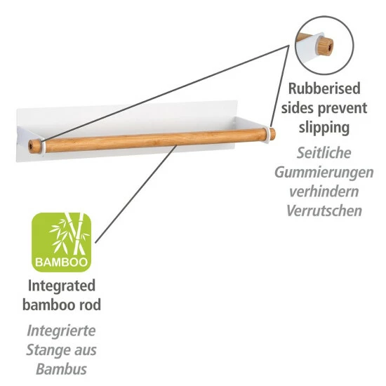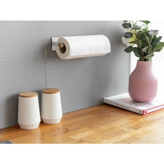 Durch die erhöhte Anbringung haben Sie die Küchentücher stets griffbereit, vor allem wenn einmal Eile geboten ist und schnell etwas aufgewischt werden muss. Das dezente Design aus pulverbeschichtetem Metall in Weiß in Verbindung mit dem natürlichen Hellbraun der integrierten Stange aus Bambus strahlt Ruhe und Wärme aus und fügt sich in Ihre Kücheneinrichtung ein. Zwei kleine Ringe an den jeweiligen Enden verhindern ein Verrutschen der Bambus-Stange beim Abrollen des Papiers.