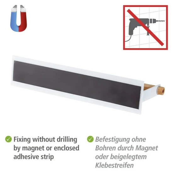Die Küchenrolle ist fester Bestandteil jeder Küche. Das Papier muss immer griffbereit sein – zum Wischen, Trocknen oder Abtropfen. Der Küchenrollenhalter Magna von WENKO bietet die perfekte, platzsparende Aufbewahrungsmöglichkeit für die nützlichen Papierrollen. Platzieren Sie den Küchenrollenhalter direkt an der Wand oder anderen geeigneten Oberflächen – und das ganz ohne Bohren.