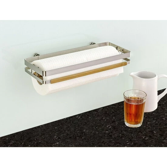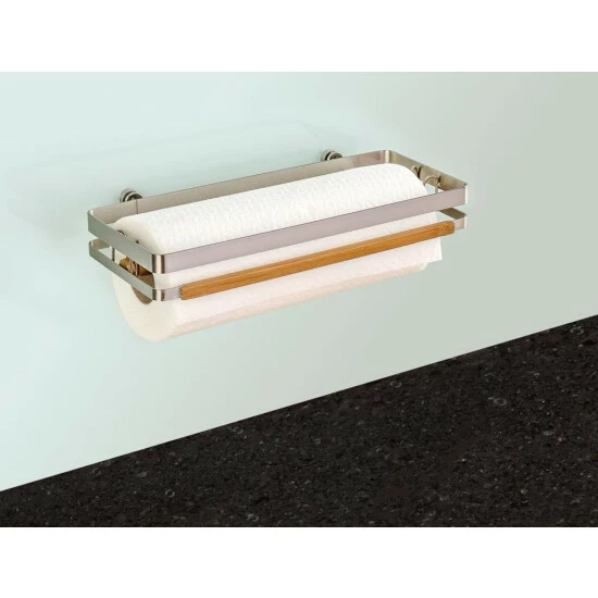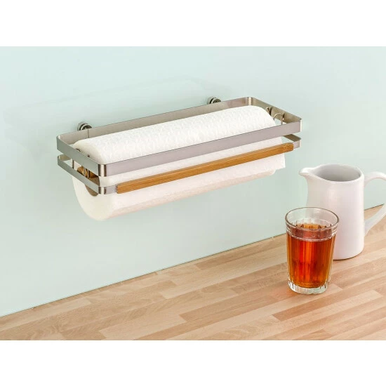 Im Premium Küchenrollenhalter aus gebürstetem Flachstahl mit Bambus-Applikation erhält die Papiertuchrolle einen festen Platz. Der Halter eignet sich für alle handelsüblichen Küchenrollen, die an der Wand hängend vor Feuchtigkeit geschützt sind.