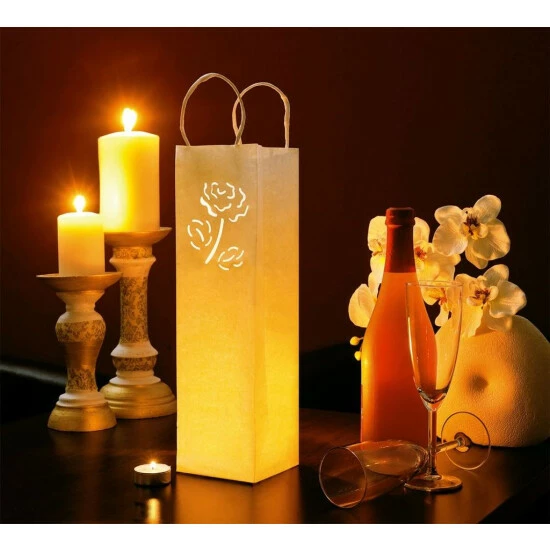 Dekorative und hochwertige Lichttüte für Teelichte der Marke Luminaria auch als Geschenktüte für Wein verwendbarAus schwer entflammbarem, hochwertigem Spezialpapier3-teiliges Set, spezielle Wein Geschenktüte mit RosenmotivMehrfach verwendbarMaße (B x H x T): je 10 x 35,7 x 9,7 cm