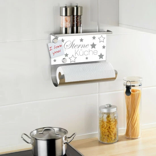 WENKO präsentiert einen hochwertigen Küchenrollenhalter aus rostfreiem Edelstahl mit integriertem Memoboard und praktischer Ablage. Der aufwendige Halter bringt stilvolle Eleganz in jede Küche. Durch den mattierten Küchenrollenhalter erhält die Papiertuchrolle einen festen Platz in der Küche. Griffbereit an der Wand hängend werden die Papiertücher nicht feucht und sind leicht abzureißen. In den dekorativen Küchenrollenhalter passen alle handelsüblichen Küchenrollen. Das ausgefallene Memo-Board ist aus gehärtetem Glas gefertigt und magnetisch. Zwei praktische Magneten werden gleich mitgeliefert. So kann man Rezepte oder Notizen gut sichtbar in der Küche platzieren. Ein absolutes Deko-Highlight stellt das integrierte, trendige Glasbild mit Sternen-Motiv dar. Zusätzlich verfügt der Küchenrollenhalter über eine praktische Ablage, auf der Öle, Gewürze und vieles mehr einen schönen, griffbereiten Platz finden. Der Universal-Halter ist ein echtes Allroundtalent und sollte in keiner Küche fehlen. Im Lieferumfang sind vier Schrauben und Dübel zur sicheren Wandbefestigung enthalten. Für eine Befestigung ohne Bohren erhalten Sie zusätzlich einen Strip-it Klebestreifen. Die praktische Strip-it Entwicklung von Wenko: Zur Anbringung einfach ankleben und bei Bedarf abziehen.