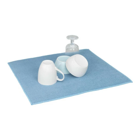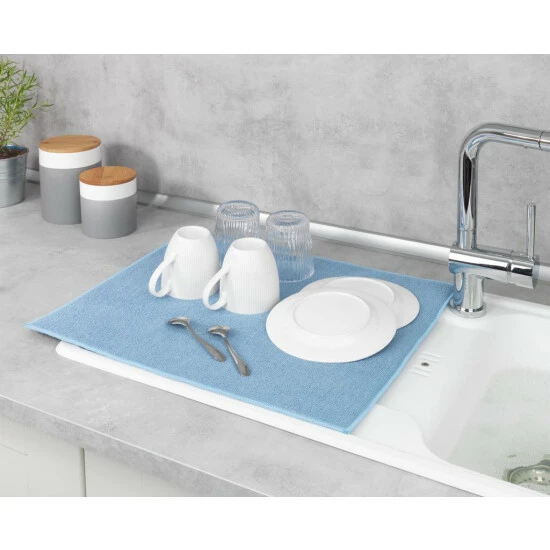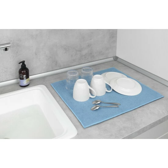 Legen Sie nach dem Abwasch einfach das nasse Geschirr auf Ihre neue Matte. Die saugfähige Mikrofaser nimmt das Wasser auf. So verhindern Sie Pfützen auf der Ablagefläche und Kalkränder an Gläsern. Das Spülgut trocknet schneller.