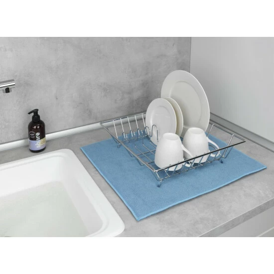 Die vorgestellte Trockenmatte besteht aus Mikrofaser. Dank des verwendeten Materials nimmt es Wasser gut auf und schützt gleichzeitig die Gefäße vor Kratzern. Die Matte kann in einem Schrank oder auf einer Arbeitsplatte neben dem Waschbecken ausgelegt werden.