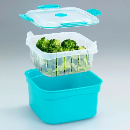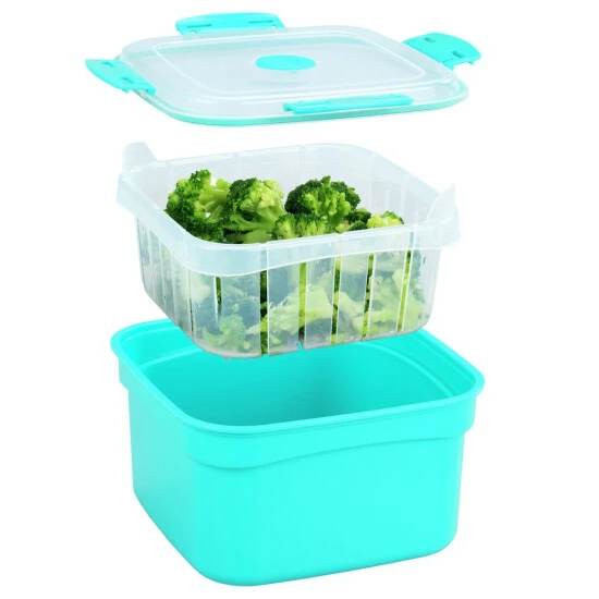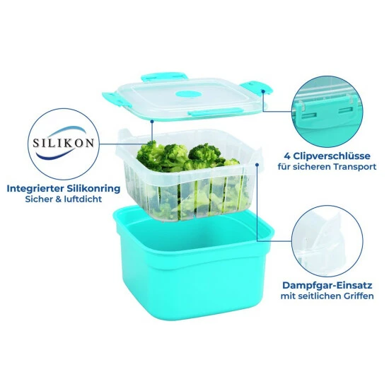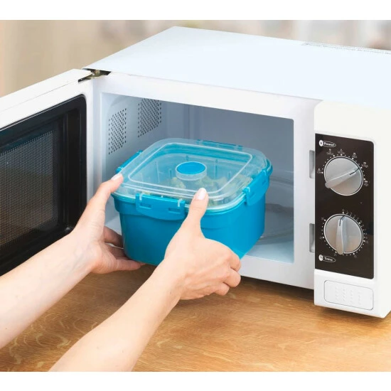 Gefertigt aus lebensmittelechtem Kunststoff (Polypropylen) und einem hochwertigen Silikon-Dichtungsring ist dieser praktische Helfer wirklich vielseitig zu nutzen. Gemüse, Kartoffeln, Fleisch, Fisch & Co. können so kurzerhand in der Mikrowelle zubereitet und anschließend genossen werden. So bleiben Nährstoffe und Aromen erhalten und natürlich schmeckt das Ganze auch viel besser. Sie müssen zu den Zutaten nur noch ein wenig Wasser geben, mit dem Deckel schließen und schon kann es losgehen.