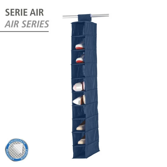 Die mobile Wohnserie Air fügt sich dezent in Blau in jede Einrichtung und bietet flexible Aufbewahrungsmöglichkeiten mit viel Stauraum. Im Multiorganizer aus der Serie Air finden bis zu 10 Paar Schuhe in 10 Aufbewahrungsfächern Platz. In den ca.15 x 30 cm großen Fächern können auch Unterwäsche, Socken, Krawatten, Schals und andere Accessoires übersichtlich verstaut werden.