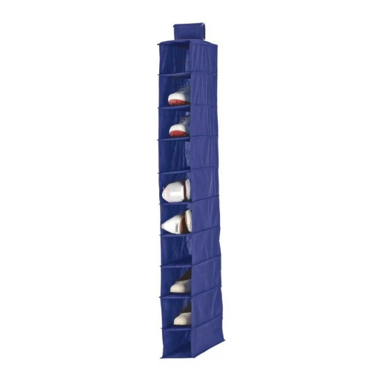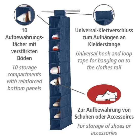 Mit zehn stabilen Aufbewahrungsfächern und Aufhängevorrichtung mit Klettverschluss bietet dieser Multi-Organizer viel Stauraum. In der Hängeaufbewahrung finden bis zu zehn Paar Schuhe in zehn Aufbewahrungsfächern Platz. In den ca. 15 x 30 cm großen Fächern können auch Unterwäsche, Socken, Krawatten, Schals und andere Accessoires übersichtlich verstaut werden.