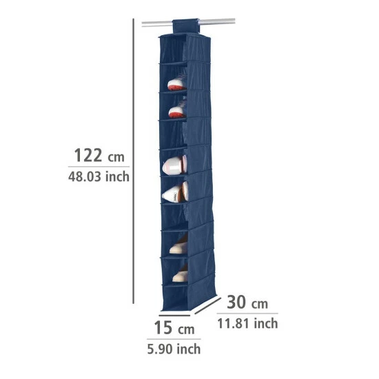 Wenko hängender Organisator Dieser handliche Organizer lässt sich leicht aufhängen. Der Organisator sorgt dafür, dass Sie Platz in Ihrem Schrank sparen und Ihre Schuhe, Handtücher oder Accessoires an einem Ort haben. So schaffen Sie sich einen Überblick in Ihrem Kleiderschrank und müssen morgens nicht aus dem Bett aufstehen, um in Ihrem Kleiderschrank nach Ihrem Lieblingspaar Schuhe zu suchen. Der Veranstalter hat zehn Abteile. Spezifikationen: Farbe: dunkelblau Geschlecht: unisex Werkstoff: Polypropylen Abmessungen: 30 x 15 x 122 cm (L x B x H) Max. Tragfähigkeit: 8 kg