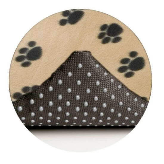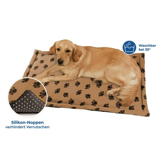 Silikon-Noppen an der Unterseite der Decke verhindern das Rutschen der Decke. Der Polyester-Boden ist zudem wasserdicht und luftdurchlässig. Bei Bedarf kann die Tierdecke bei 30ºC in der Maschine gewaschen werden. Die Tierdecke in L ist 120 x 75 cm groß.
