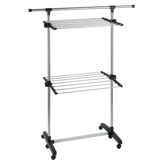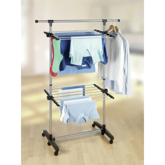 Der Platzspar-Wäschetrockner von Maximex ist ein echter Allrounder für viel Wäsche auf wenig Grundfläche. Auf zwei Etagen finden alle Wäschestücke ausreichend Platz zum Trocknen. Die 14 breiten Stangen bieten eine Trockenlänge von insgesamt 11 Metern.
