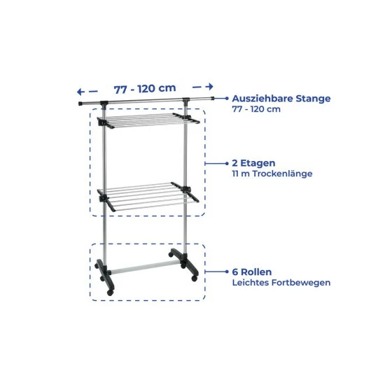 - Ideal als Garderobe, zum Lüften oder als Bügelhilfe, obere Stange (77 – 120 cm) ausziehbar
