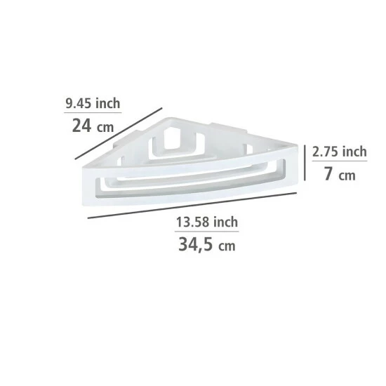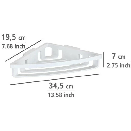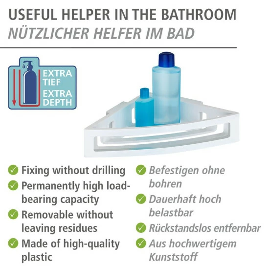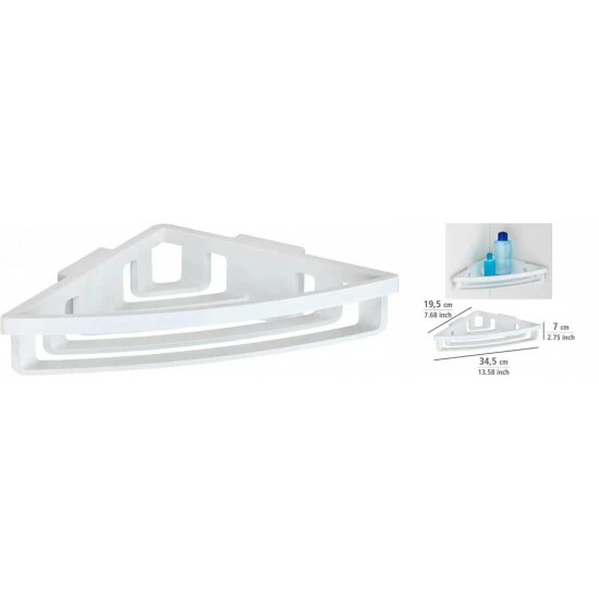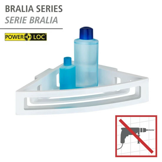 - Lieferumfang: Duschablage Bralia, Eckregal zum Kleben (Zugkraft von bis 80 kg), aus Kunststoff, inkl. Spezialkleber sowie Schrauben und Dübeln zur alternativen Wandbefestigung, Maße (B x H x T): 34,5 x 8,5 x 19,5 cm