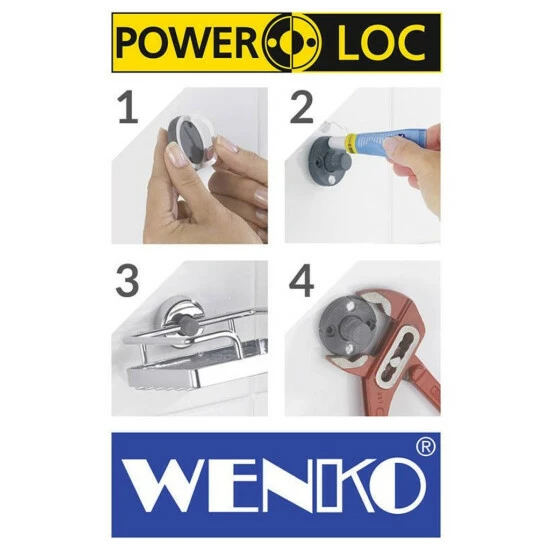 - Das Power-Loc Befestigungssystem zeichnet sich durch extrem festen Halt auf allen tragfähigen Oberflächen, z.B. Fliesen, Naturstein, Glas, Beton, Metall, Holz und vielen Kunststoffen aus.