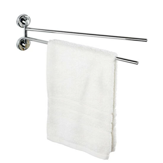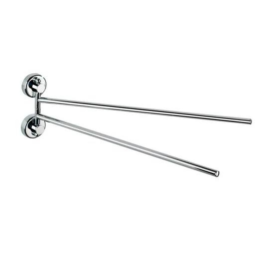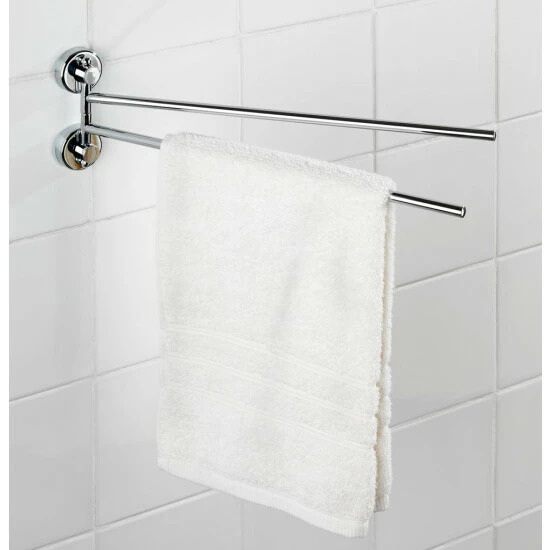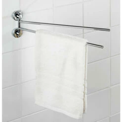 Der dezente Handtuchhalter aus der Bad-Serie Sion löst schnell und einfach das Problem fehlender Aufhängemöglichkeiten im Badezimmer. Die praktischen Stangen sind aus glänzendem Chrom gefertigt und benötigen zur Anbringung wenig Raum. Die beiden übereinanderliegenden, beweglichen Arme bieten ausreichend Platz für zwei Handtücher.