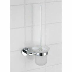 Der abnehmbare Behälter aus satiniertem Glas wird mit weißer WC-Bürste mit verchromtem Messingstiel geliefert.