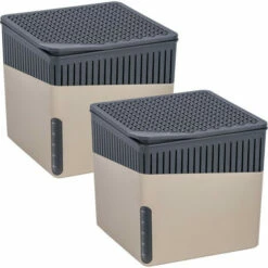 Im Lieferumfang sind zwei Design-Entfeuchter Cubes und zweimal 1 kg Calciumchloridblöcke enthalten.