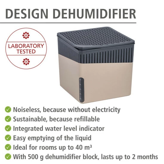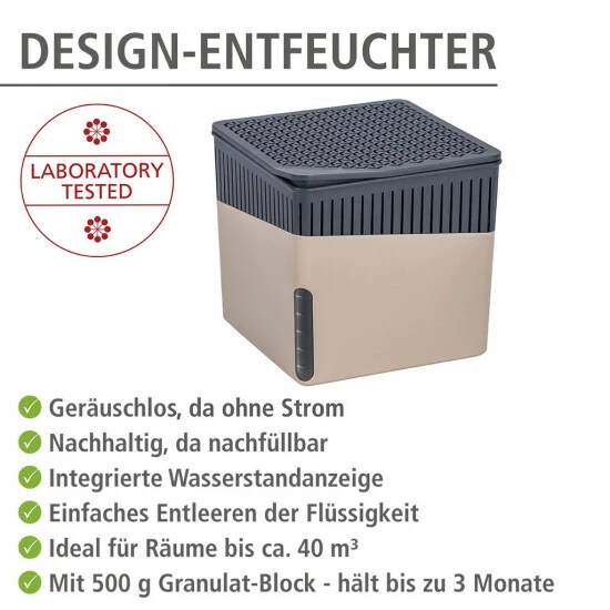 Der Design-Entfeuchter Cube von WENKO im natürlichen Beige sorgt für weniger Feuchtigkeit und Wohlfühlklima! Dabei integriert sich der moderne Luftentfeuchter stilvoll in jeden Raum und schafft ein optisches Highlight in angesagter Cube-Form.