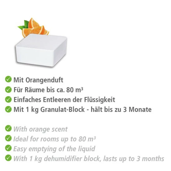 Dieses eignet sich ideal für Räume von bis zu 80 m³ und beginnt sofort nach dem Aufstellen, die Feuchtigkeit aus der Umgebung zu ziehen. Der Luftentfeuchter kommt völlig ohne Strom aus. Er entzieht der Umgebungsluft Feuchtigkeit für bis zu 3 Monate und verströmt einen angenehmen, frischen Orangenduft.