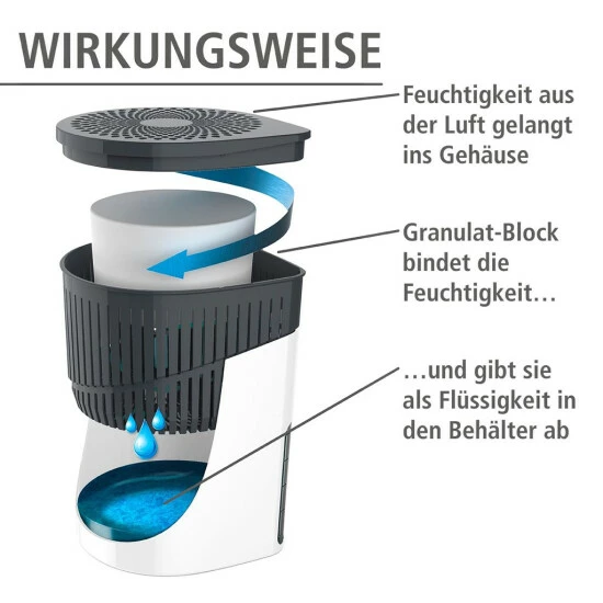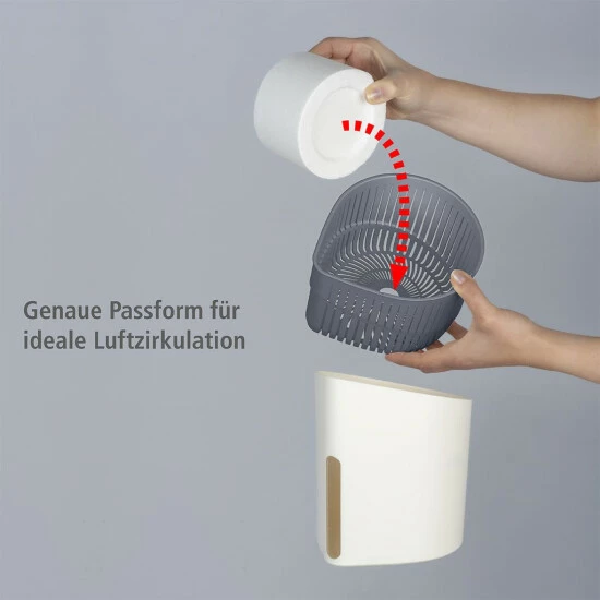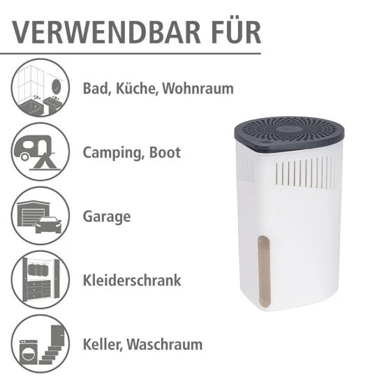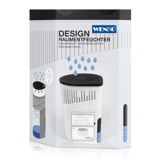 Der Luftentfeuchter kommt völlig ohne Strom aus. Er entzieht der Umgebungsluft Feuchtigkeit für bis zu 3 Monate. Natürlich sind passende Nachfüllpacks von WENKO unter den Artikelnummern 50270100 und 50271100 erhältlich.