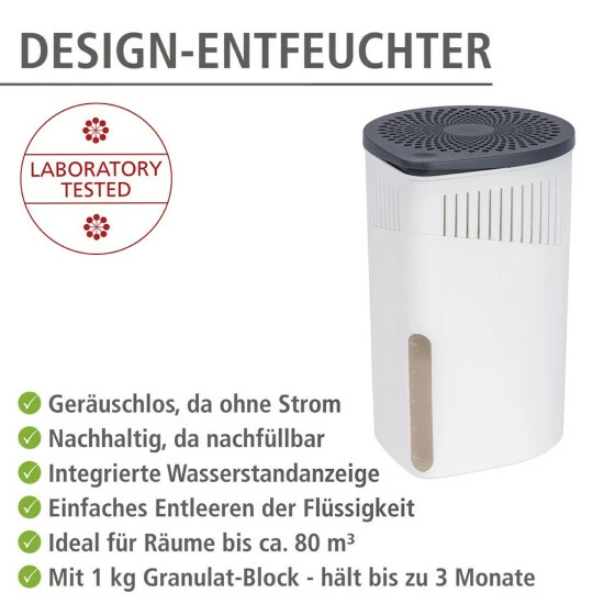 Der clevere Entfeuchter eignet sich ideal für Räume von bis zu 80 m³. Im Feuchtigkeitsentferner sind 1.000 g Calciumchlorid enthalten, das sofort nach dem Aufstellen beginnen, die Feuchtigkeit aus der Umgebung zu ziehen. Das sich im Raumentfeuchter sammelnde Wasser kann durch die integrierte Wasserstands-Anzeige jederzeit sicher abgelesen werden und ist ein Beleg für die Effektivität des Feuchtigkeitskillers von WENKO.