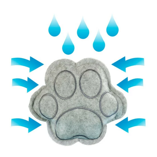 Nach der langen Wirkungsdauer von bis zu 3 Monaten kann der Entfeuchter einfach auf der Heizung, in der Mikrowelle oder dem Backofen getrocknet und danach wiederverwendet werden. Wichtigster Bestandteil des Entfeuchter-Materials ist Montmorillonit (60-80 %), das über eine starke Wasseraufnahmefähigkeit verfügt und somit pro Anwendung bis zu 85 % des Eigengewichts an Wasser aufnehmen. Der dekorative Luftentfeuchter in Tatzenform eignet sich außerdem ideal zur Entfeuchtung im Auto, in Schränken oder der Garage.