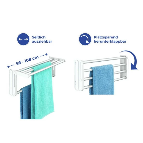 Seitlich ausziehbar von 58 bis 108 cm erreicht der Trockner eine Trockenlänge von bis zu 4,15 m. Durch seinen breiten Stangenabstand ist er auch zum Aufhängen von dickerer Wäsche geeignet. Nach dem Gebrauch kann er platzsparend heruntergeklappt werden.