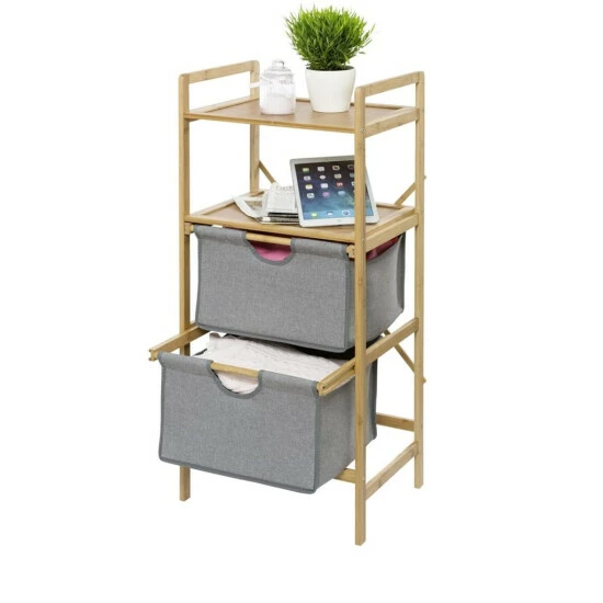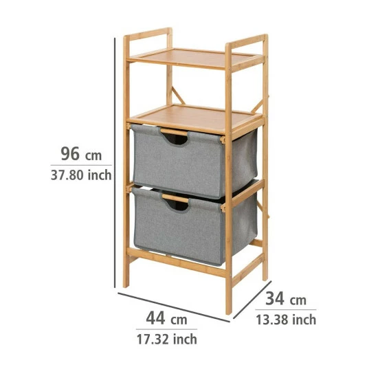 Bahari Schrank mit zwei praktischen Schubladen ausgestattet ist ein einzigartiges Möbelstück, das perfekt in jedem Haus Interieur präsentieren wird! Suchen Sie nach bemerkenswerten Lösungen bei der Dekoration einer Wohnung? Setzen Sie auf originelle Möbel, die in nur wenigen Augenblicken Ihrem Zimmer einen besonderen Charakter verleihen. Der Kabinett Bahari wird im Badezimmerinnenraum als Stauraum für Handtücher, Kosmetika und andere Accessoires sowie im Schlafzimmer, Kinder- oder Jugendzimmer gut aussehen, wo es abgesehen von seinen praktischen Anwendungen eine einzigartige Inneneinrichtung sein wird. Bahari ist ein Stand mit zwei praktischen Regalen und zwei geräumigen Körben ausgestattet. Das Produkt mit den Abmessungen von 44 x 96 x 34 cm wird alle Anwender mit solider Verarbeitung und originellem Design begeistern. Produkteigenschaften: Bambushalter mit einziehbaren Körben. Es verfügt über 2 Regale für die Aufbewahrung von Zubehör. Auch mit 2 Schubladen ausgestattet. Feuchtigkeitsbeständiges Material, so dass das Möbelstück im Badezimmer verwendet werden kann. Zur Verwendung im Bad, Schlafzimmer, Kinderzimmer, Wohnzimmer.