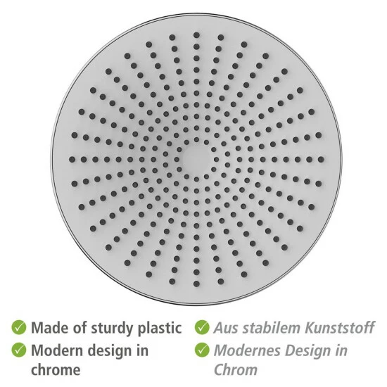 Hergestellt ist der Regenduschkopf aus stabilem Kunststoff (ABS). Durch die Noppen an der Brause lässt er sich leicht reinigen. Etwaige Kalkablagerungen an den Düsen können einfach mit dem Finger abgerieben werden. Der langlebige Duschkopf verfügt über einen 1/2 Universalanschluss und ist auch für Duschen mit Durchlauferhitzer geeignet.