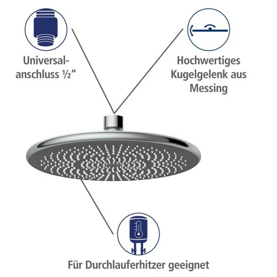 Die Brause hat einen Universalanschluss mit 1/2 und ist auch für Durchlauferhitzer geeignet. Der Duschkopf kann ohne Brausearm direkt an der Decke befestigt werden. Auch die Befestigung an einer Duschstange ist möglich.