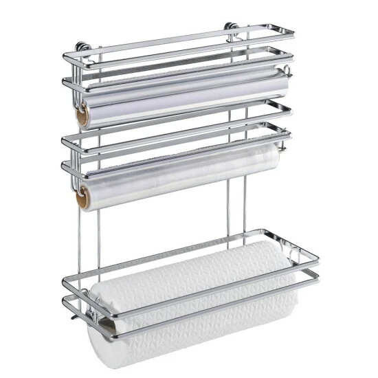 Küchengriff auf 3 Ebenen. Enthält ein Papierhandtuch, Plastik- und Aluminiumfolie, Frühstückspapier oder Backpapier. Es schützt sie effektiv vor Nässe und erleichtert die Entwicklung. Darüber hinaus wird es die notwendigen Dinge immer zur Hand haben. Montage mit den mitgelieferten Schrauben und Dübeln. Ein alternatives Bohrinstallationssystem ist Vacuum-Loc, Turbo-Loc und Static-Loc.