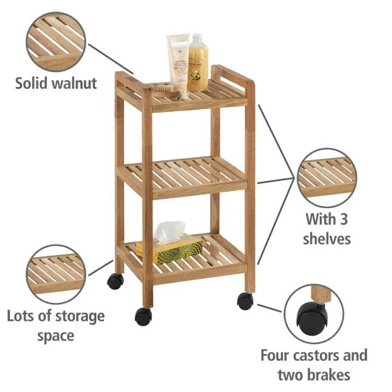Funktionalität und Form sind bei diesem Rollregal erstklassig gelungen. Durch die natürliche und dezente Ausstrahlung des Walnussholzes ist dieses Möbelstück ein Blickfang in jeder Wohnung. Nicht nur im Bad ist sehr gut aufgehoben, um Waschutensilien zu verstauen. Auch im Arbeitszimmer oder Flur ist es hilfreich und praktisch. Diese Rollregal hat 3 Ablageflächen mit viel Stauraum. Durch die Rollen lässt es sich leicht und einfach an die gewünschte Stelle bringen. Das hochwertige massive Walnussholz mit Verzapfung (kein Furnier), ist sehr stabil und belastbar. Es wurde mit natürlichem Holzöl veredelt. Durch das Naturmaterial sind Unterschiede in der Maserung und Struktur des Holzes möglich.